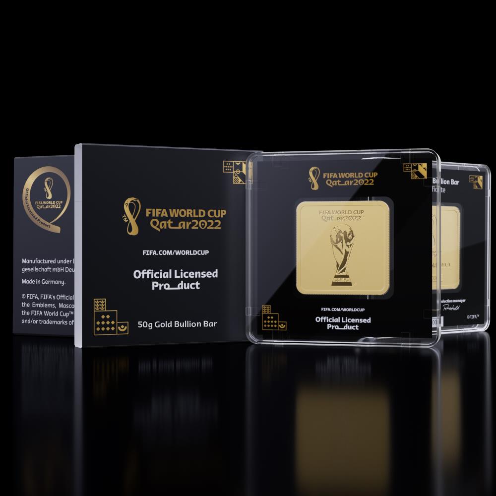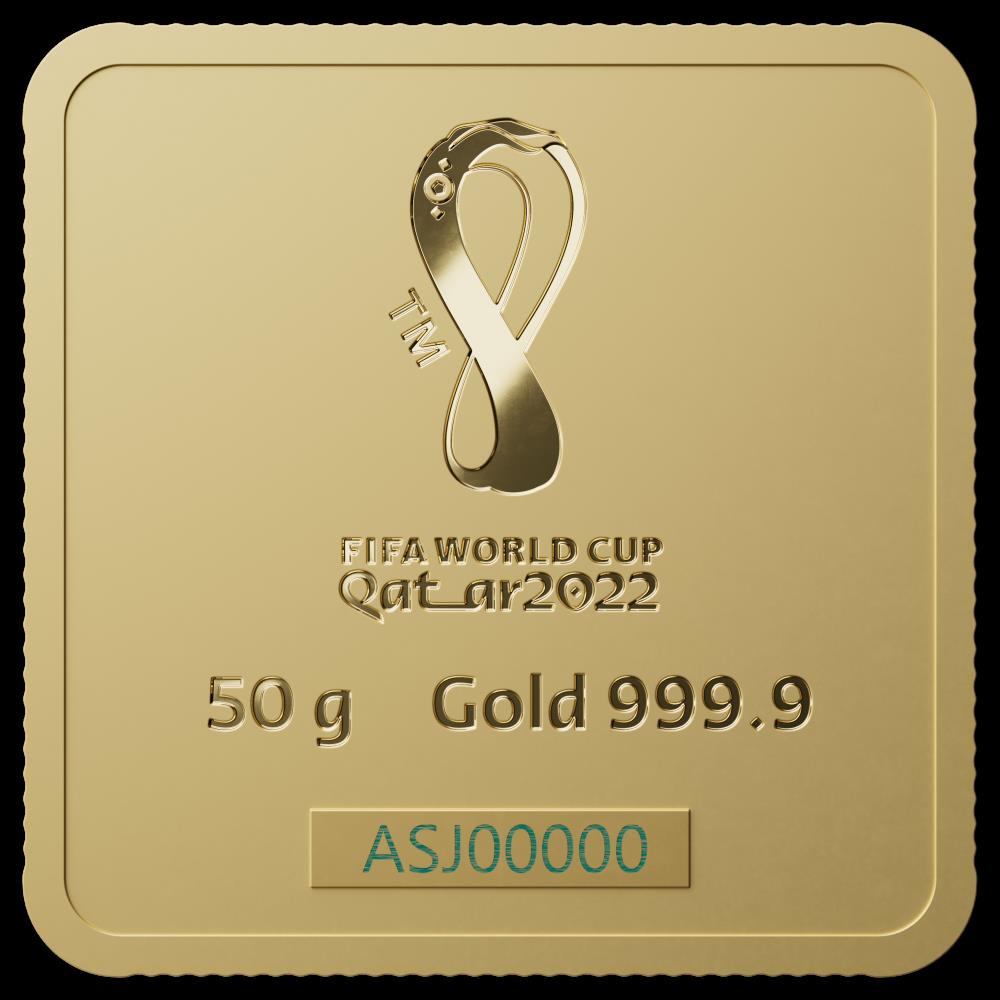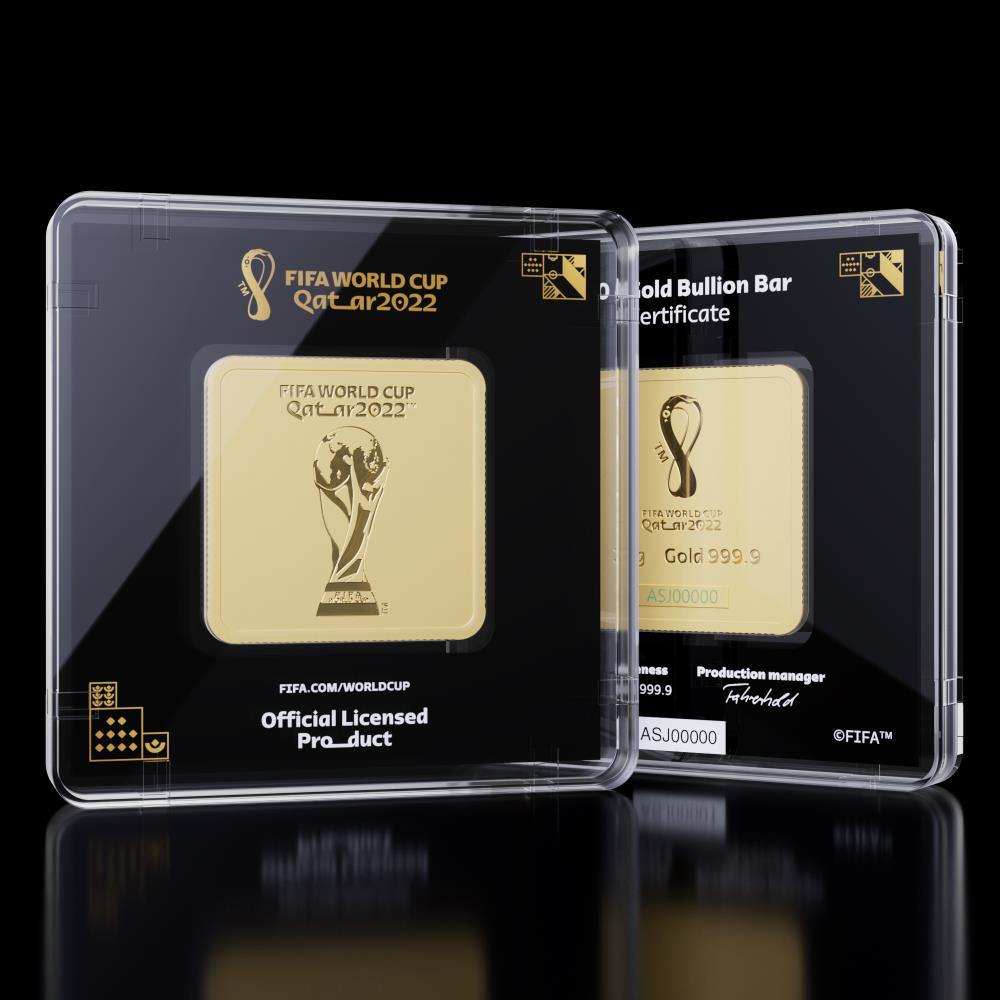 منتج FIFA المرخص ️ - سبائك ذهبية مصممة بشكل فريد محفور عليها الكأس الأيقوني والشعار الرسمي من كأس العالم FIFA قطر 2022 ™