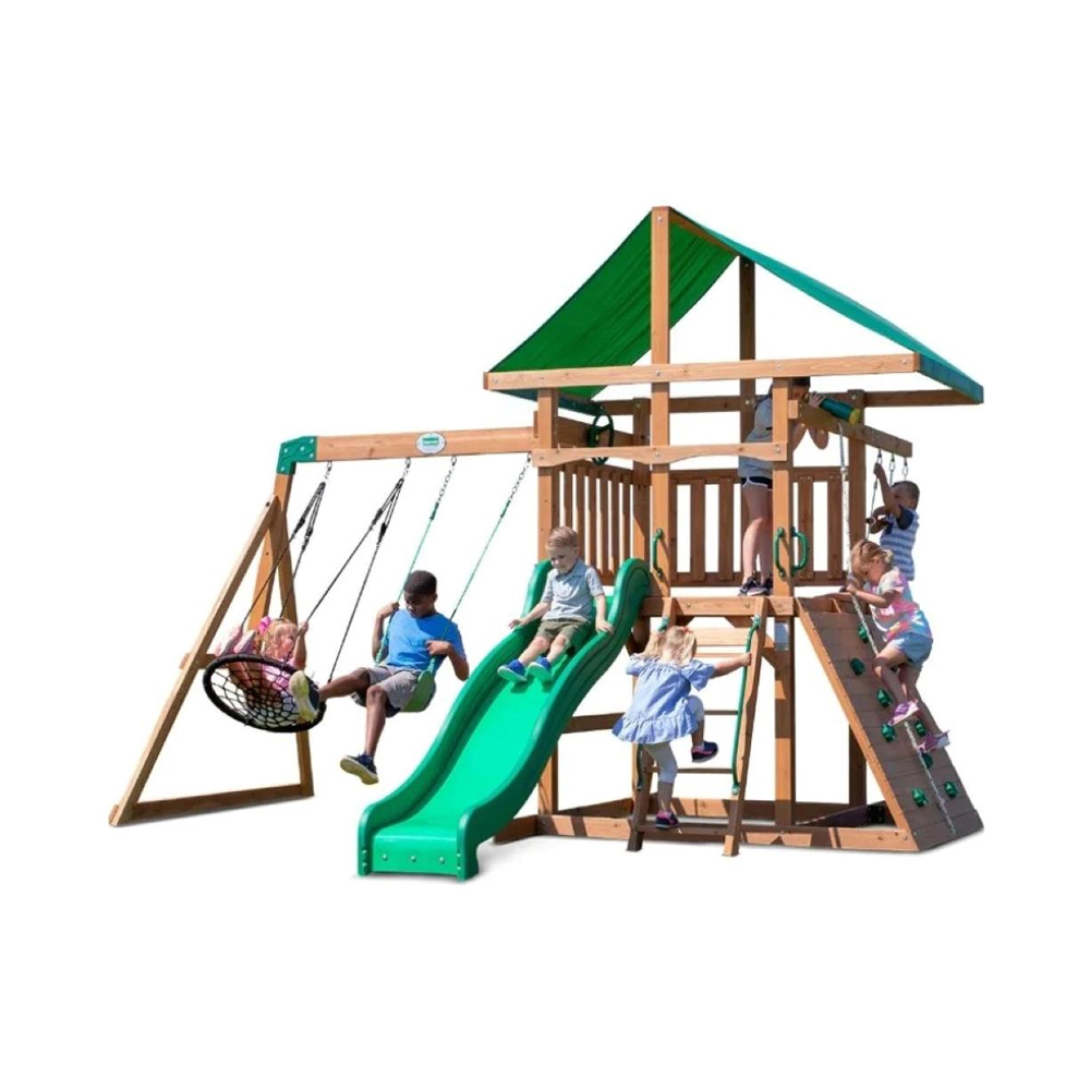 توفر مجموعة الألعاب الخشبية قمة جرايسون واستكشاف الفناء الخلفي فرصة مثالية لجميع المتسلقين الصغار لتوسيع خيالهم لأقصى درجة. يساعد جدارنا الصخري المزدوج الذي يبلغ ارتفاعه 4 أقدام على تحسين مستوى تنسيق أطفالك بين أيديهم وقدمهم وأعينهم بالإضافة إلى تقوية العضلات مع المساعدة في تحسين القدرة البدنية. يوفر الجدار المزدوج الواسع و9 مرابط صخرية مساحة كافية لتسلق طفلين في وقت واحد. يوفر سلم الحبل المعلق ميزات تسلق إضافية غير موجودة في مجموعات التأرجح الخشبية التقليدية وفرصة ممتعة للوصول إلى السطح العلوي الذي تبلغ مساحته 17 قدمًا مربعًا. يستطيع أطفالك التزلق لأسفل على المزلقة السريعة التي يبلغ ارتفاعها 8 أقدام للاستمتاع بالهواء الطلق على الأرجوحة المميزة أو التأرجح على الأرجوحة المثبتة بالحزام شديد التحمل. تحتوي اللعبة أيضاً على منطقة لعب علوية للاستمتاع بالجو الرائع وجنباً إلى جنب مع السقف الأخضر والتلسكوب وعجلة القيادة التي لا تمنح أطفالك حصناً ضخماً مع مميزات رائعة للعب فقط، بل أيضاً توفر لك فرصة كبيرة للشعور بالأمان على أطفالك حيث تستطيع رؤية أطفالك من بعيد ومراقبتهم بسهولة. تقدم اللعبة مساحة كافية لتخزين الألعاب في منطقة اللعب السفلية المظللة مما يسهل العثور عليها بسرعة. امنح أطفالك فناءً خلفيًا أفضل مع مجموعة الأرجوحة الخشبية "قمة جرايسون".